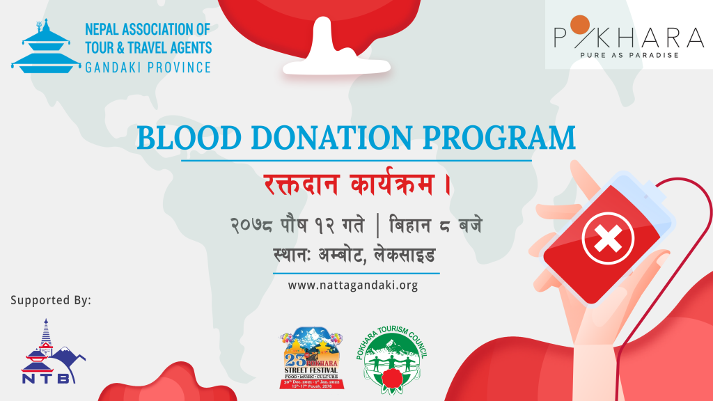 नेपाल एसोसिएसन अफ टुर एण्ड ट्राभल एजेन्ट्स (नाट्टा) — गण्डकी प्रदेशको आयोजनामा यही पौष १२, २०७८ लेकसाईडको अम्बोटमा रक्तदान कार्यक्रम सम्पन्न गरिएको छ।